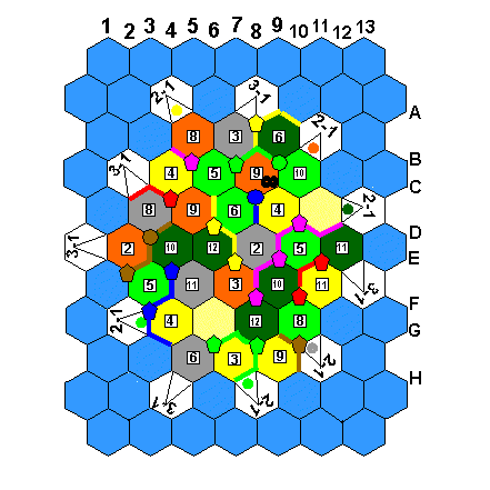 | Mike | 10 | Brad gains L. David & Mike gain 2L. Al gets 2W | Mike builds a road from D11-D12. David builds a road from G11-H11. |