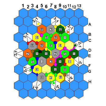 | Paraic | 8 | Gains W & O. Mike gains B. David gains W and 2O. | Plays Soldier and moves Robber to Lumber-10 at D4/E4, steals an Ore from David. Mike builds a settlement at D12 2-1 Port. |